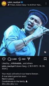 গায়ক জুবিন গর্গ-এর মৃত্যুতে শোক প্রকাশ করেছেন দেব। সোশাল মিডিয়ায় জুবিনের ছবি শেয়ার করে লিখেছেন, ‘তোমাকে খুব মিস করব ভাই। ভালো থেকো।’ শোকপ্রকাশ করেছেন অভিনেতা প্রসেনজিৎ চট্টোপাধ্যায় ও।ইনস্টা স্টোরিতে জুবিনের ছবি শেয়ার করে শোকবার্তা দিয়েছেন অভিনেতা। গায়কের মৃত্যু মেনে নিতে পারছেন গায়ক পাপন। জুবিনের প্রয়াণ পাপনের কাছে ভ্রাতৃবিয়োগসম। গায়কের মন্তব্য, ‘খুবই মর্মান্তিক! জুবিন, একপ্রজন্মের কণ্ঠস্বর! এত তাড়াতাড়ি চলে গেল। ভাষা হারিয়ে ফেলেছি। একজন বন্ধুকে হারিয়ে আমি বাকরুদ্ধ। ভাইকে হারালাম। এই বিরাট শূন্যতা পূর্ণ হওয়ান নয়। ওঁর আত্মার শান্তি কামনা করছি।’ জুবিনের মৃতিতে শোকস্তব্ধ সঙ্গীত পরিচালক প্রীতম। তিনি বলেন, “একটা দুর্ঘটনা জুবিনের প্রাণ কেড়ে নিল, এর থেকে ভয়াবহ এবং দুর্ভাগ্যজনক খবর হয় না। আমি এখনও মেনে নিতে পারছি না…। জুবিনের স্ত্রী গরিমা এবং ওঁর পরিবারের প্রতি আমার গভীর সমবেদনা।” ‘শিব’ নাম করে সঙ্গীতশিল্পী জুবিন নটিয়ালের শোকবার্তা, ‘জুবিন তোমার গান চিরকাল আমাদের মনে প্রতিধ্বনিত হবে। একজন সত্যিকারের প্রতিভা খুব তাড়াতাড়ি চলে গেলেন। ওঁর পরিবারের প্রতি সমবেদনা।’ এক্স হ্যান্ডেলের পোস্টে ব়্যাপার বাদশা লিখেছেন, ‘জুবিন গর্গের সঙ্গে দেখা না হলেও ওঁর গান শুনেছি। ওঁর গল্প শুনেছি। কখনও ভাবিনি ওঁর মৃত্যুটা আমাকে এভাবে কষ্ট দেবে। শান্তিতে ঘুমোও জুবিনদা।’ গায়ককে হারিয়ে শোকস্তব্ধ অমল মালিক, বিশাল মিশ্রও (Zubeen Garg)।