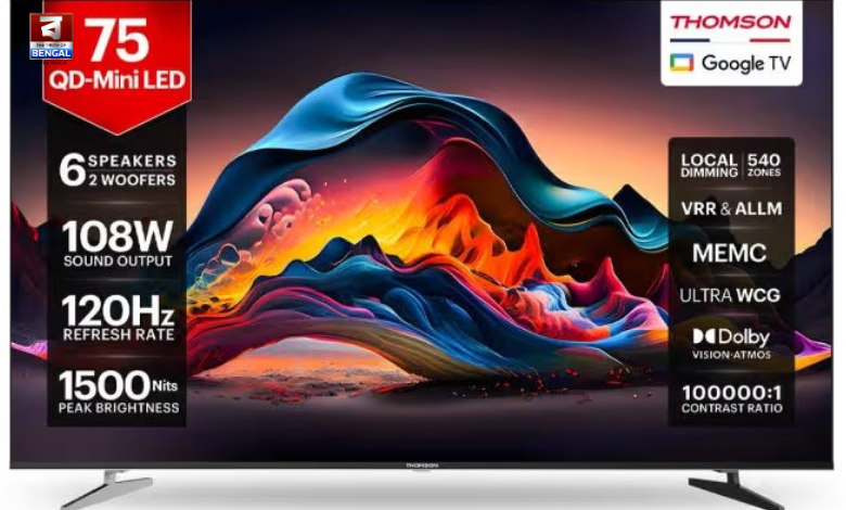 Truth of Bengal: যারা বড়ো ডিসপ্লে সহ স্মার্ট টিভি পছন্দ করেন, তাদের জন্য ফ্রান্সের কঞ্জিউমার ইলেক্ট্রনিক ব্র্যান্ড Thomson ভারতে তাদের নতুন Mini QD LED TV সিরিজ আনল। Mini QD LED TV সিরিজের অধীনে 65 ইঞ্চি এবং 75 ইঞ্চির দুটি মডেলের স্মার্টটিভি আনা হয়েছে যাতে কোয়াড এলইডি প্যানেল দিয়ে তৈরি 4K ডিসপ্লে রয়েছে। Thomson Mini QD LED TV এর 65 ইঞ্চির মডেলের দাম পড়বে ৬১৯৯৯ টাকা। অন্যদিকে 75 ইঞ্চির ডিসপ্লে সহ স্মার্টটিভির মডেলের দাম ৯৫৯৯৯ টাকা পড়বে। ই-কমার্স সাইট ফ্লিপকার্টের মাধ্যমে এই স্মার্টটিভি কেনা যাবে। যেকোনো জায়গায় এই স্মার্টটিভি সেট করার জন্য মেটাল স্ট্যান্ড দেওয়া হয়েছে।