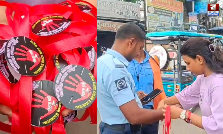 DYFI-এর কর্মী ও সমর্থকেরা পথ চলতি মানুষের হাতে পরিয়ে দিলেন হাতে তৈরি ‘বিচার চাই’ লেখা রাখি।