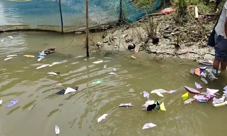 Students and teachers float paper boats in Tangan River, Buniadpur, as symbolic protest to demand restoration of the drying watercourse.