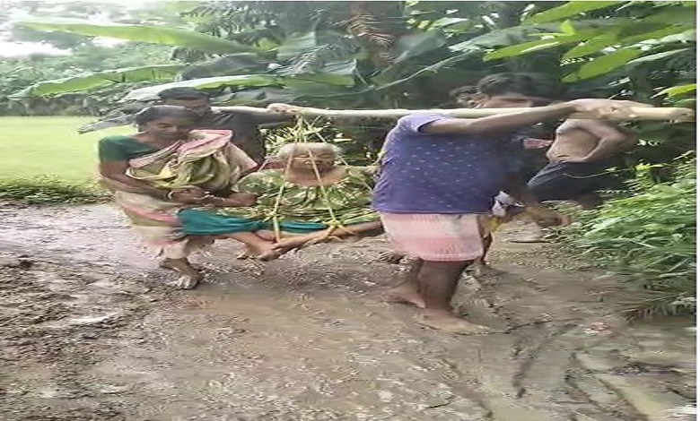 A sick elderly woman had to be carried in a bamboo cradle in West Midnapore's Narayangarh as no vehicle could access the muddy, broken village road.